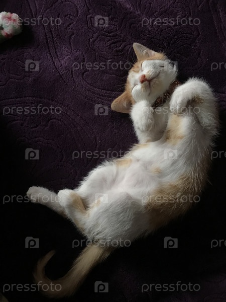 Маленький котенок. Окрас котенка рыжий с белым. Лежа на диване. Вид сверху