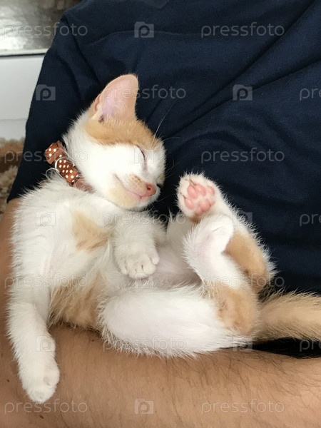 Маленький котенок. У него есть ошейник с колокольчиком. Окрас котенка рыжий с белым. Спит в забавной позе на спине. На предплечье мужчины. Крупный план