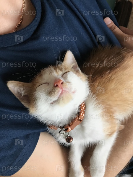 Маленький котенок. У него есть ошейник с колокольчиком. Окрас котенка рыжий с белым. Спит в забавной позе на спине. На предплечье мужчины. Крупный план