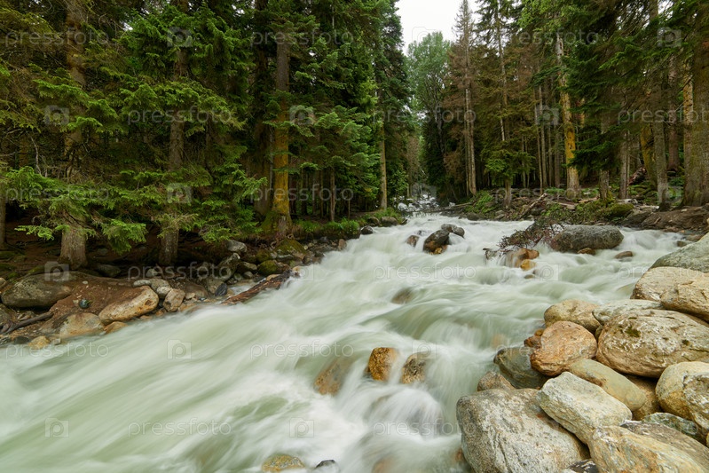 Река с быстрой пенящейся водой в сосновом лесу. Уллу-Муруджу, Северный Кавказ, Россия