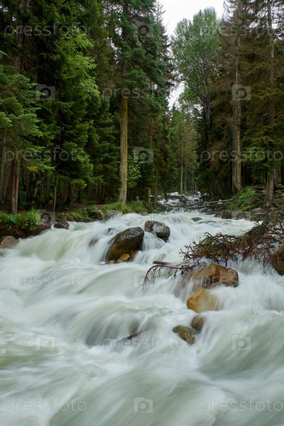 Горная река с быстрой пенящейся водой в сосновом лесу. Уллу-Муруджу, Северный Кавказ, Россия