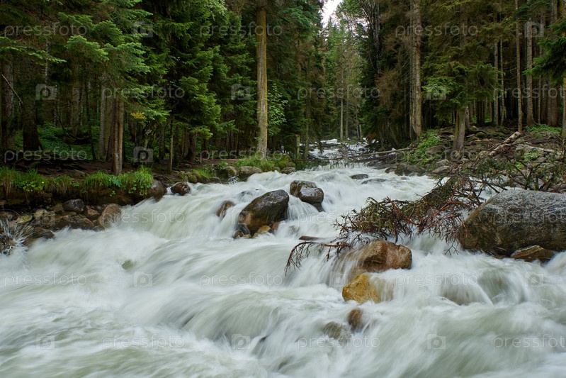 Река с быстрой пенящейся водой в сосновом лесу. Уллу-Муруджу, Северный Кавказ, Россия