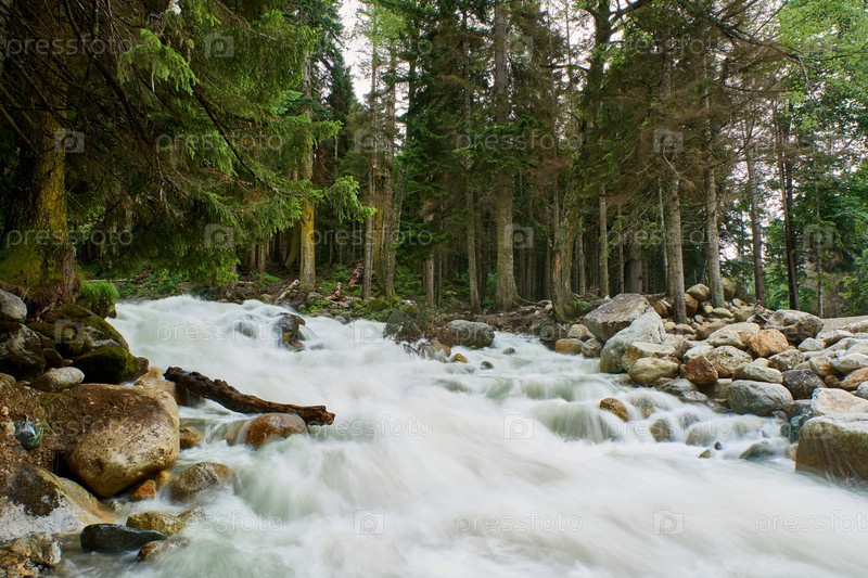 Река с быстрой пенящейся водой в сосновом лесу. Уллу-Муруджу, Северный Кавказ, Россия