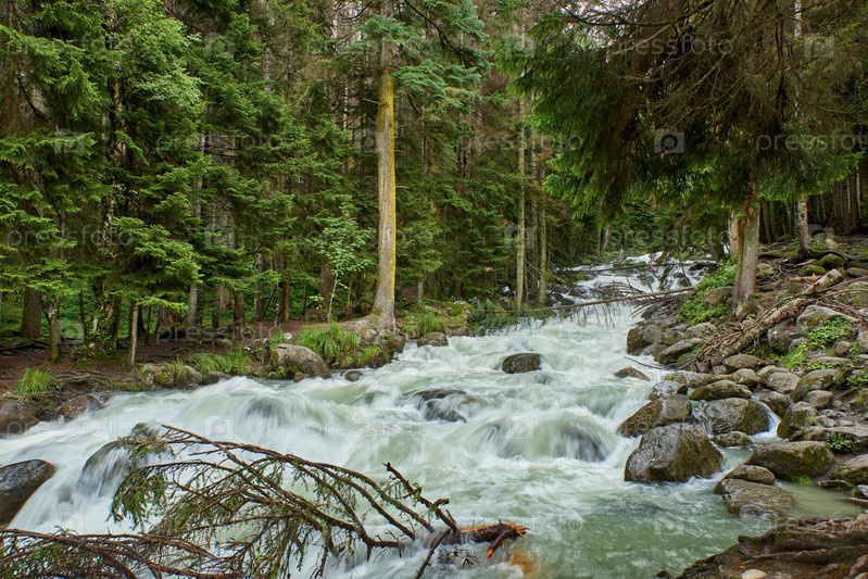 Река с быстрой пенящейся водой в сосновом лесу. Уллу-Муруджу, Северный Кавказ, Россия