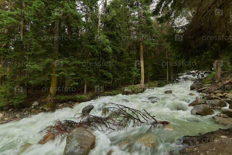 Река с быстрой пенящейся водой в сосновом лесу. Уллу-Муруджу, Северный Кавказ, Россия