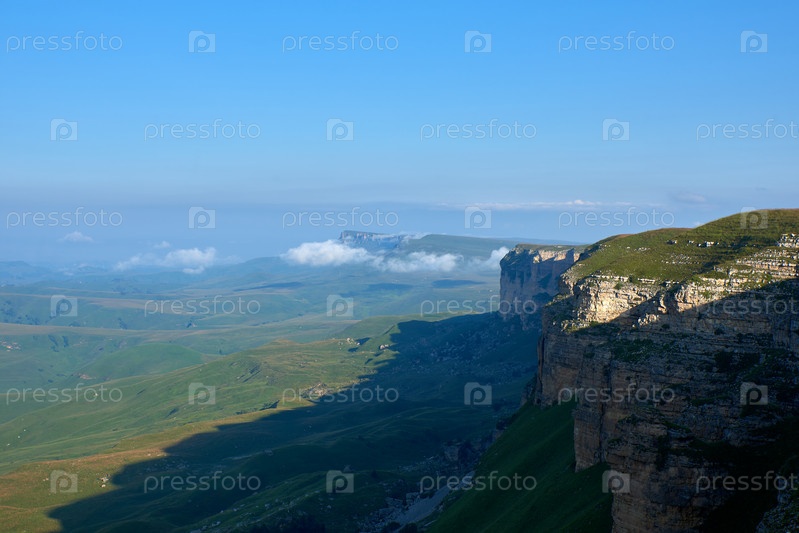 Скалистый утес в тумане и зеленой долине. Северный Кавказ Россия