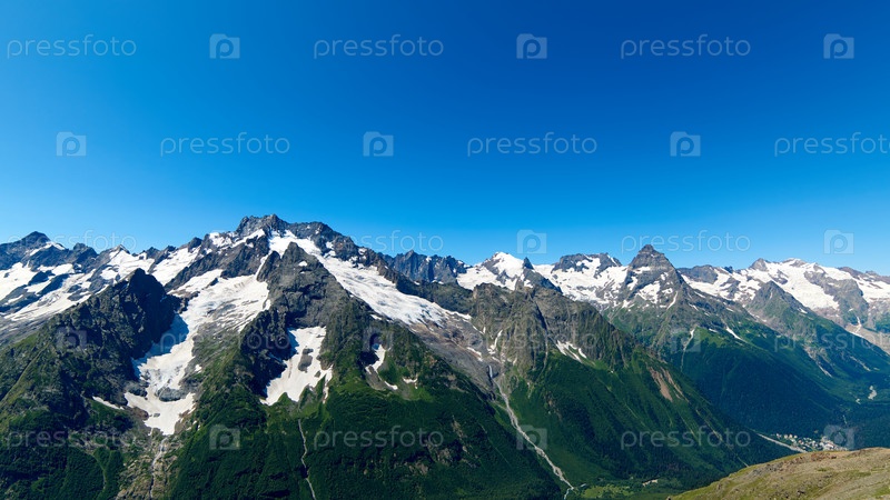 Горные вершины с ледником и началом горного ручья. Северный Кавказ, Россия