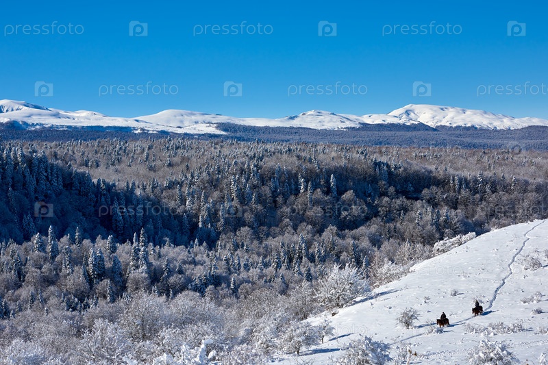 Два всадника верхом едут по снегу на фоне гор и голубого неба