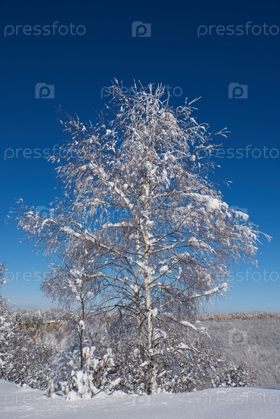 Одинокое заснеженное дерево на фоне голубого неба. Снег на переднем плане