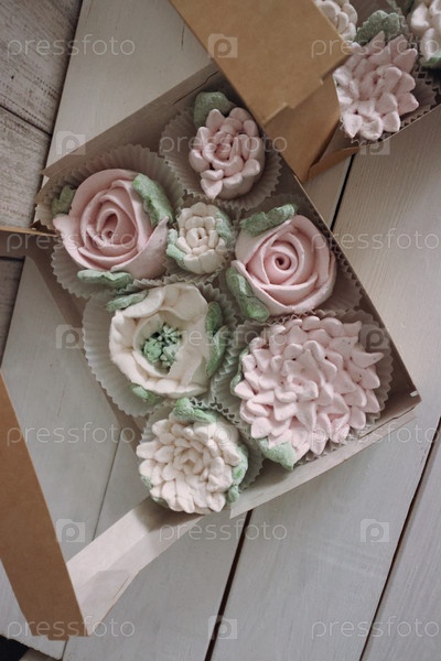 Домашний зефир в бумажной подарочной упаковке. Зефирные цветы. Коробка открыта. Вид сверху