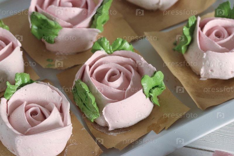 Домашний зефир. Зефирные цветы. На подносе. На белых досках. Крупный план