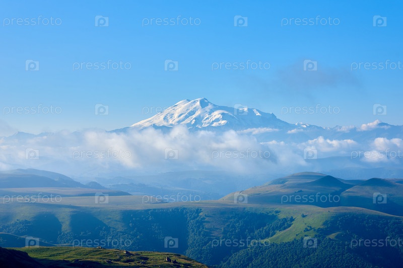 Эльбрус на рассвете, туман и облака на переднем плане. Северный Кавказ, Россия