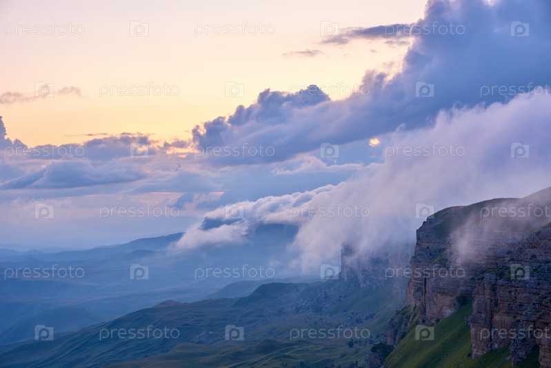Закат в горах. Солнце светит сквозь туман над горным хребтом. Северный Кавказ Россия