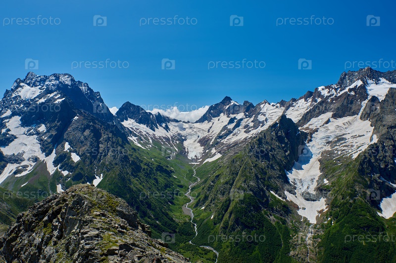 Горный массив с ледником и началом горного ручья. Северный Кавказ, Россия