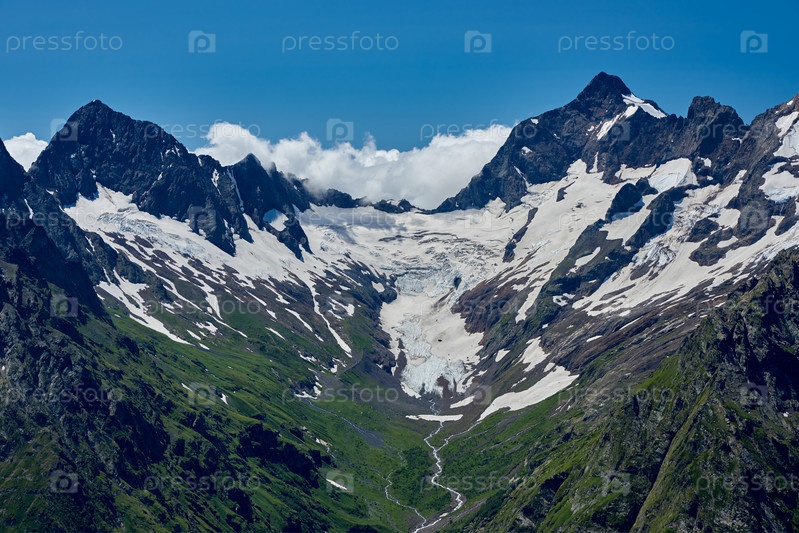 Горные вершины с ледником и началом горного ручья, протекающего через сосновый лес. Северный Кавказ, Россия