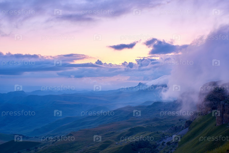 Закат в горах. Солнце светит сквозь туман над горным хребтом. Северный Кавказ Россия