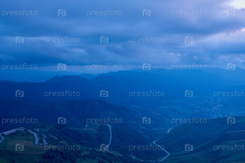 Облака и туман над вечерней горной долиной. Северный Кавказ Россия