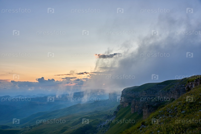 Вечерний туман над скалистым утесом. Северный Кавказ Россия