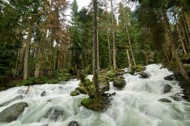 Река с быстрой пенящейся водой в сосновом лесу. Уллу-Муруджу, Северный Кавказ, Россия