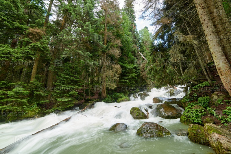 Река с быстрой пенящейся водой в сосновом лесу. Уллу-Муруджу, Северный Кавказ, Россия