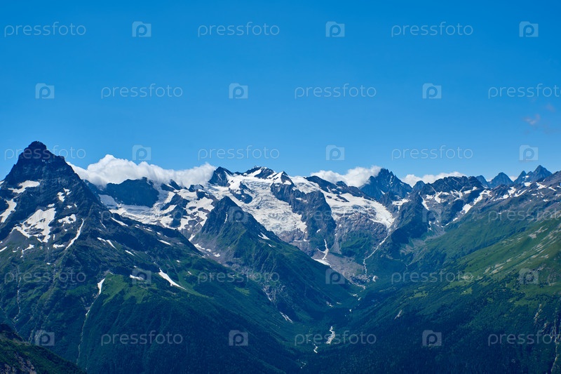 Горные вершины с ледником и началом горного ручья, протекающего через сосновый лес. Северный Кавказ, Россия
