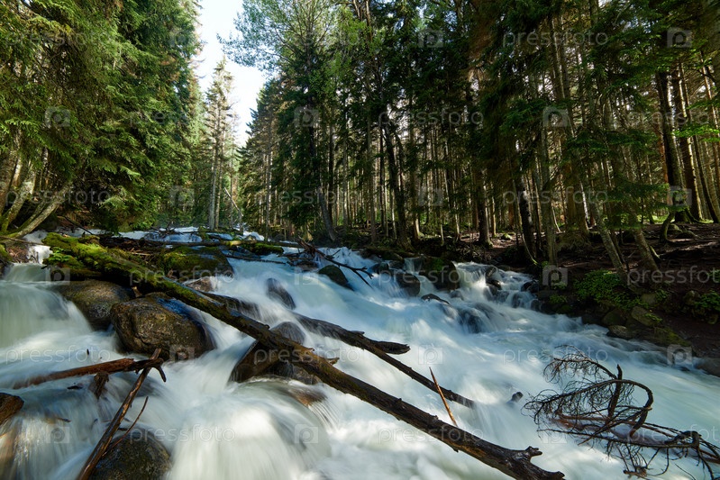 Река с быстрой пенящейся водой в сосновом лесу. Уллу-Муруджу, Северный Кавказ, Россия