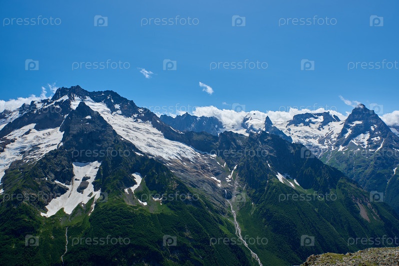 Горные вершины с ледником и началом горного ручья. Северный Кавказ, Россия
