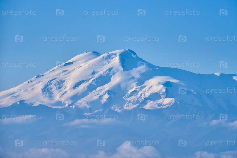 Эльбрус на рассвете, туман и облака на переднем плане. Северный Кавказ, Россия