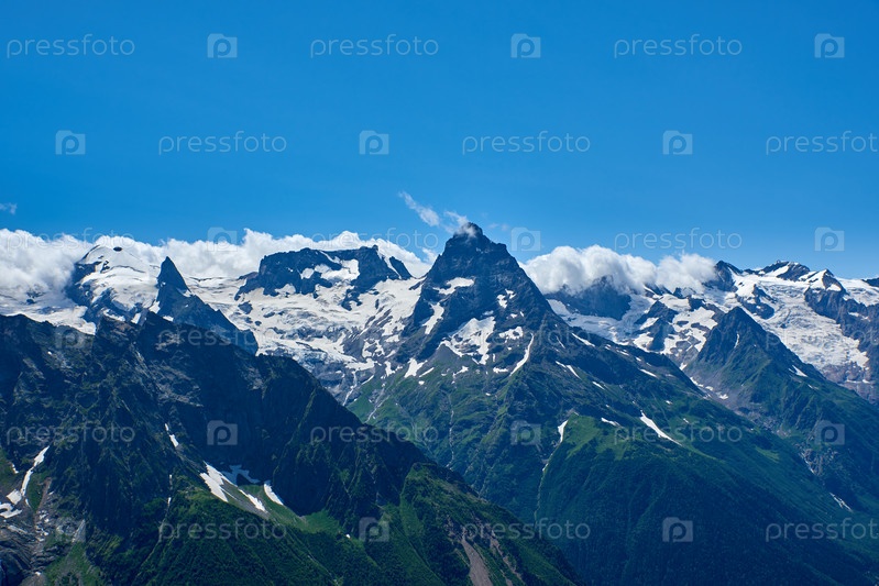 Горные вершины с ледником и началом горного ручья, протекающего через сосновый лес. Северный Кавказ, Россия