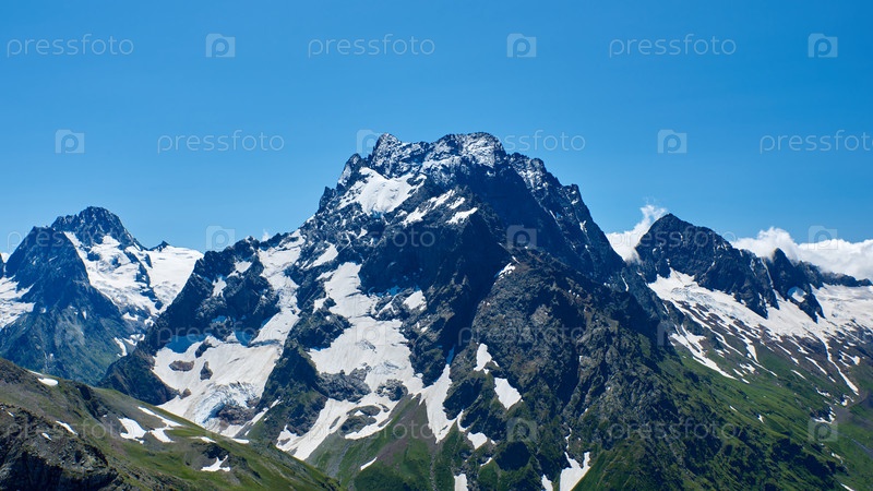 Горная вершина в черном цвете, покрытая ледниками и снегом. Домбай, Северный Кавказ, Россия