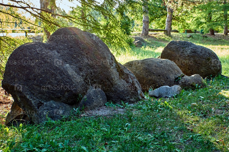 Окаменелый аммонит, похожий на инопланетного жителя, на фоне леса