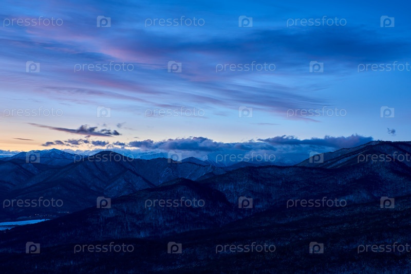 Пурпурно-голубые облака в предрассветном небе над горным хребтом. Темный лес на переднем плане