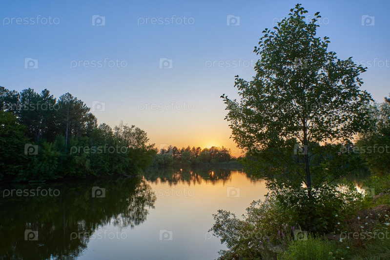 Закат на озере с голубой водой и небом, на переднем плане шалфей и круглые камни