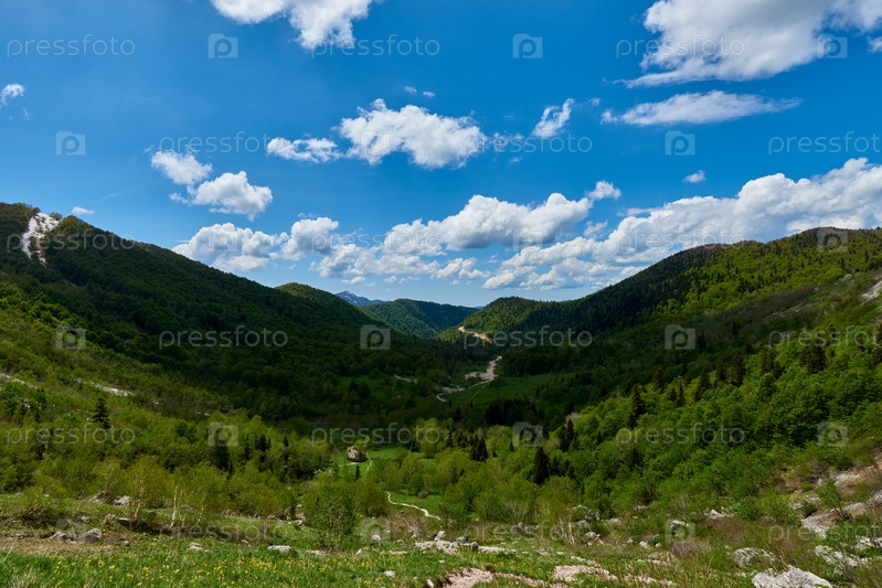 Белые кучевые облака над горно-зеленой долиной