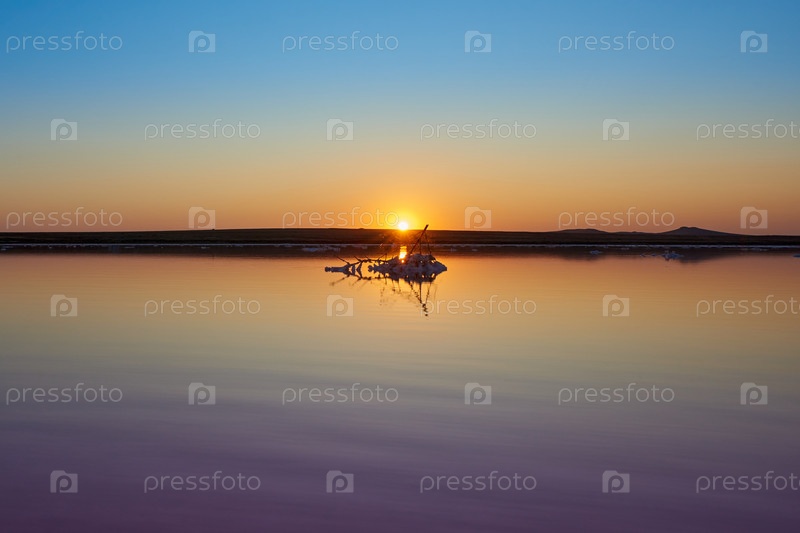 Закат на Кояшском соленом озере с розовой водой. Кояшское — соленое озеро на побережье Керченского полуострова в Криминале. Россия