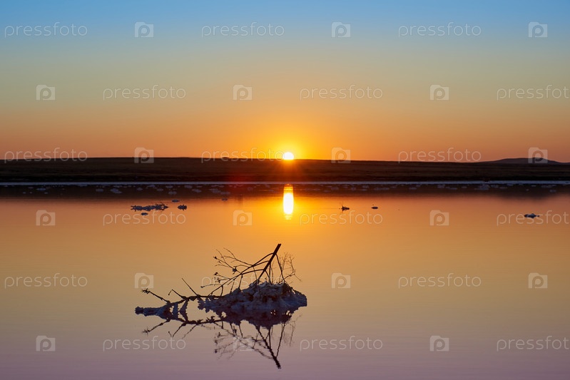 Закат на Кояшском соленом озере с розовой водой. Кояшское — соленое озеро на побережье Керченского полуострова в Криминале. Россия