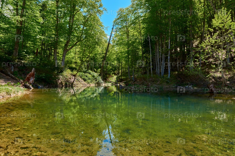 Небольшое озеро с прозрачной водой, окруженное зеленым лесом