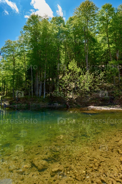 Небольшое озеро с прозрачной водой, окруженное зеленым лесом