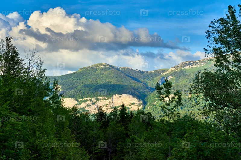 Белые кучевые облака над горно-зеленой долиной