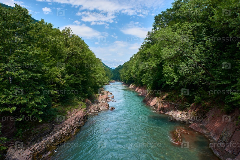 Горная река с зеленой водой, окруженная берегами красного гранита и зеленого леса