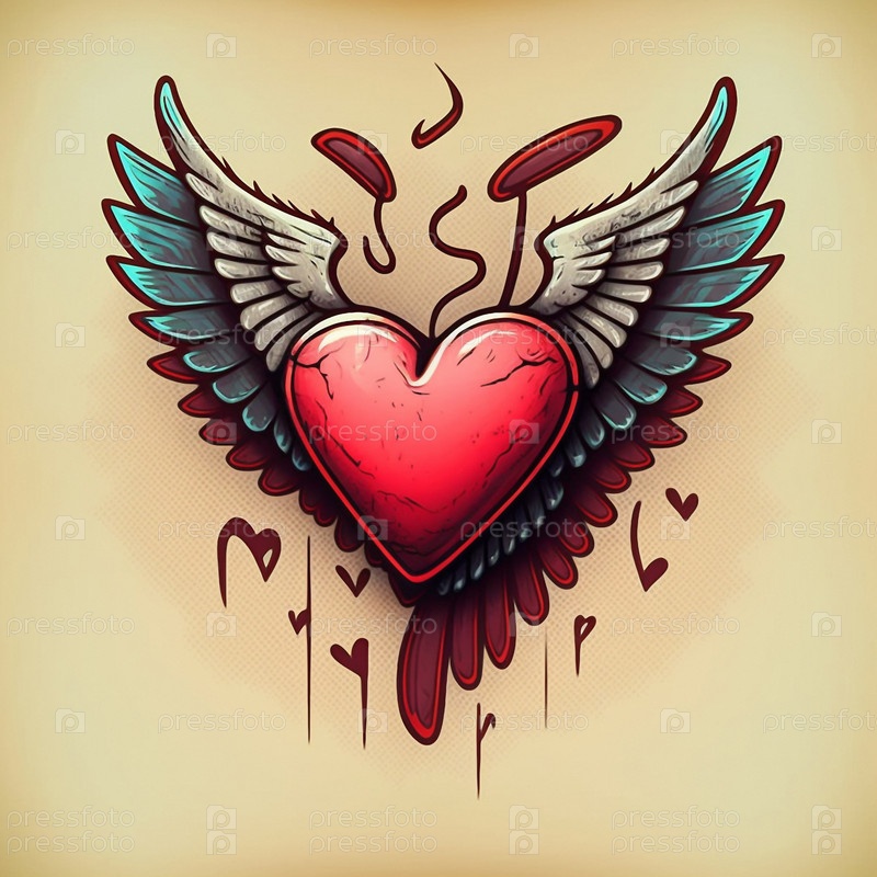 Мультяшный графический рисунок поющего сердца с крыльями