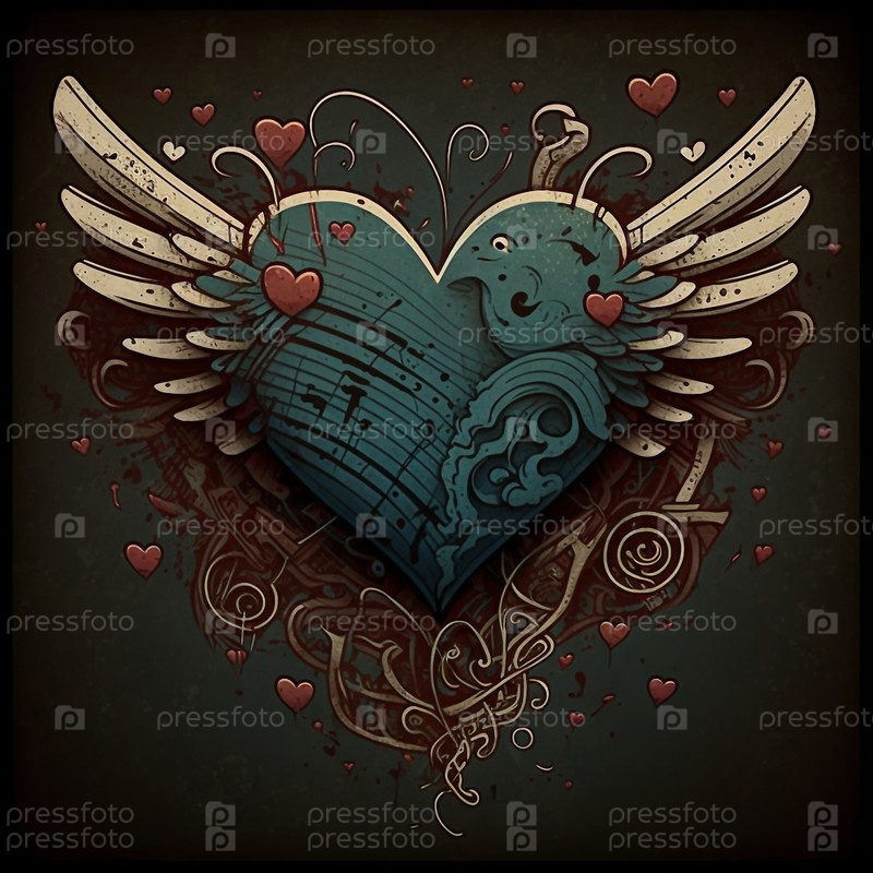 Мультяшный графический рисунок поющего сердца с крыльями