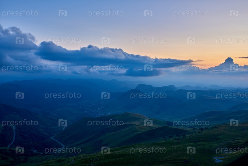 Облака и туман над вечерней горной долиной. Северный Кавказ Россия