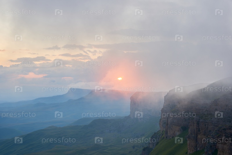 Закат в горах. Солнце светит сквозь туман над горным хребтом. Северный Кавказ Россия