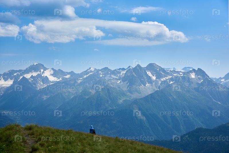 Женщина и ребенок смотрят на скалистые горы под облачным небом. Архыз Северный Кавказ Россия