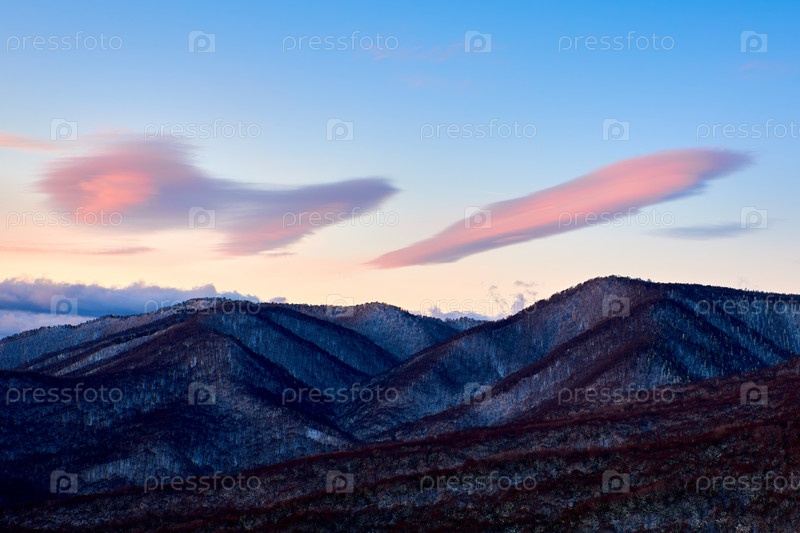 Необычные розовые облака в голубом небе на рассвете. Розовые облака над горами. Лес на переднем плане