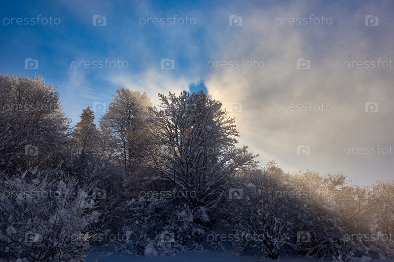Солнечные лучи светят сквозь заснеженные и покрытые инеем деревья в зимний день