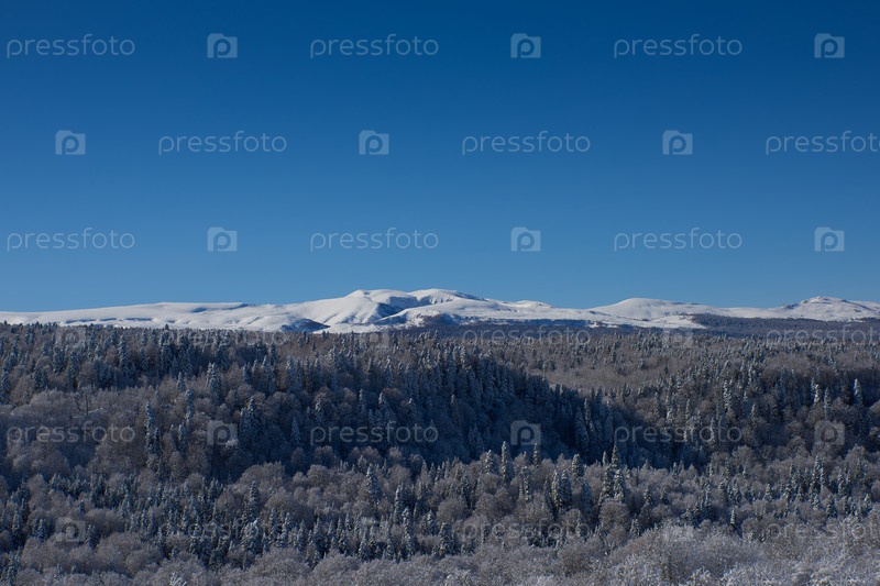 Деревья, покрытые снегом и инеем в морозный зимний день на фоне заснеженных гор