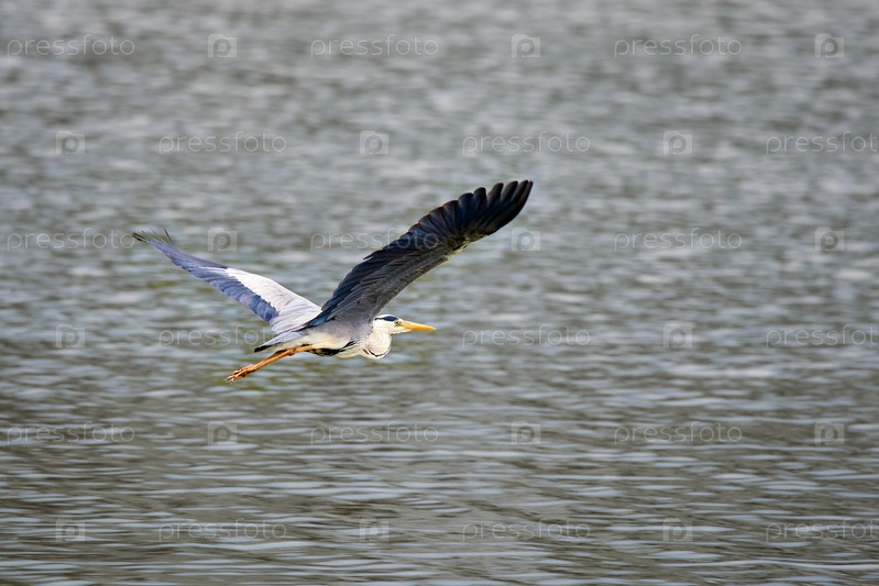 Серая цапля (Ardea cinerea) летает над водой