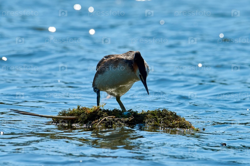 Большая хохлатая поганка в плавательном гнезде